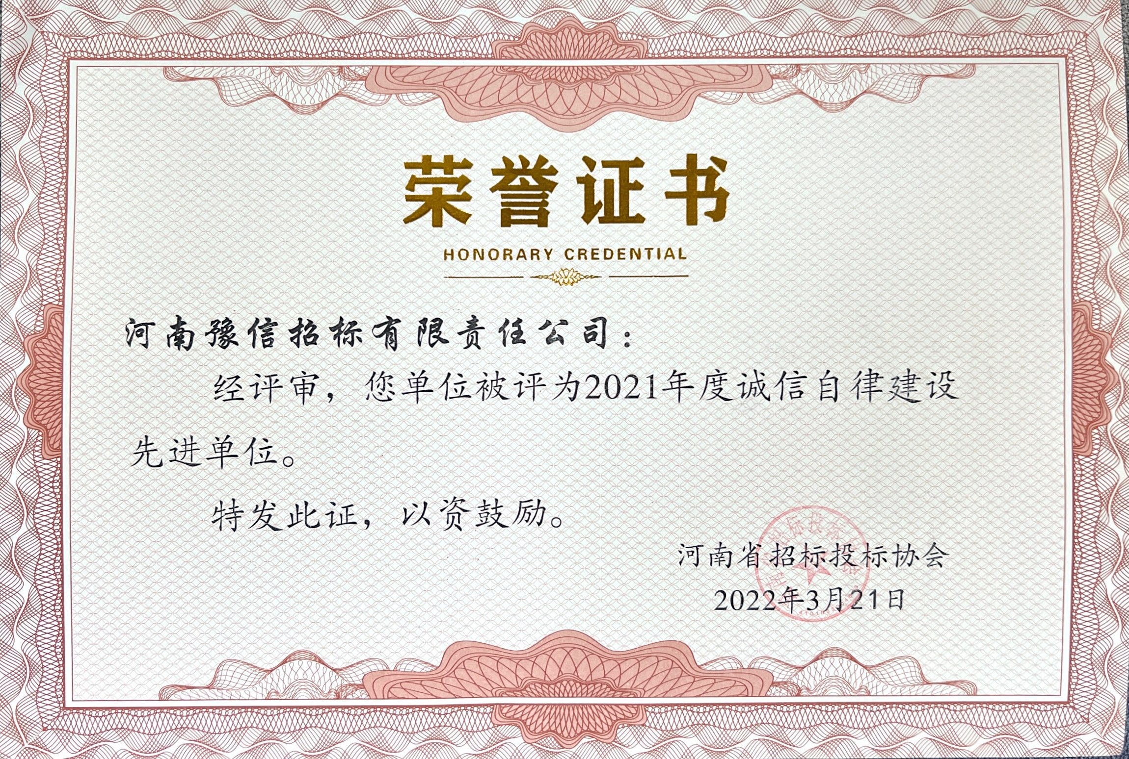 2021年度誠信自律建設(shè)先進單位 -