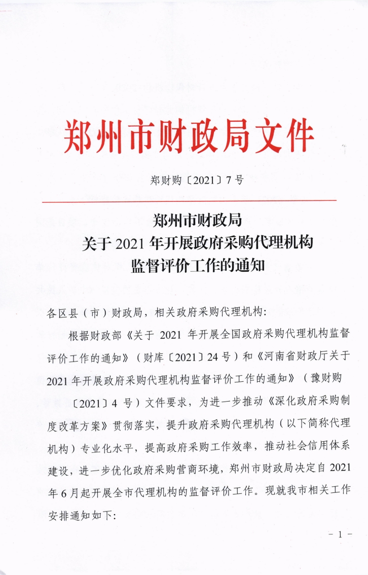 鄭州市財政局 關(guān)于2021年開展政府采購代理機構(gòu)監(jiān)督評價工作的通知