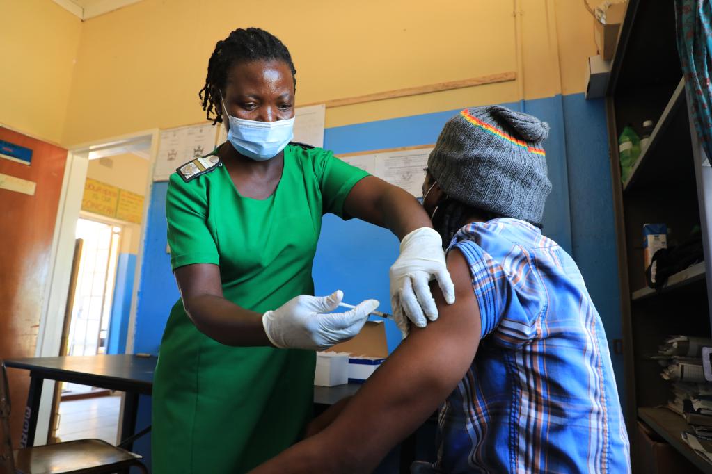 2021年2月22日,醫(yī)務(wù)工作者在津巴布韋中部省戈奎的醫(yī)院內(nèi)為當(dāng)?shù)鼐用窠臃N中國(guó)國(guó)藥集團(tuán)新冠疫苗。