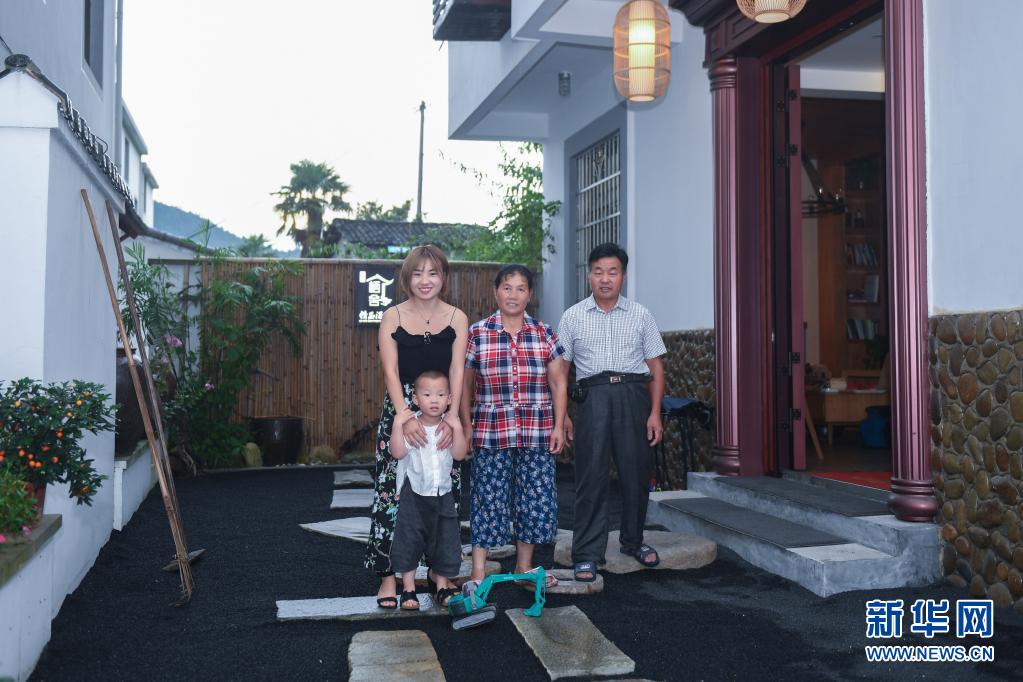 2017年8月9日,在浙江省淳安縣楓樹嶺鎮(zhèn)下姜村,村民姜麗娟(左一)與父親姜北方(右一)、母親王洋球(中)及兒子安安在自家開辦的“棲舍”民宿院內(nèi)合影。新華社記者 黃宗治 攝