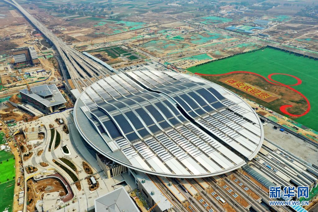 這是4月9日拍攝的京雄城際鐵路雄安站(無人機照片)。新華社記者 牟宇 攝