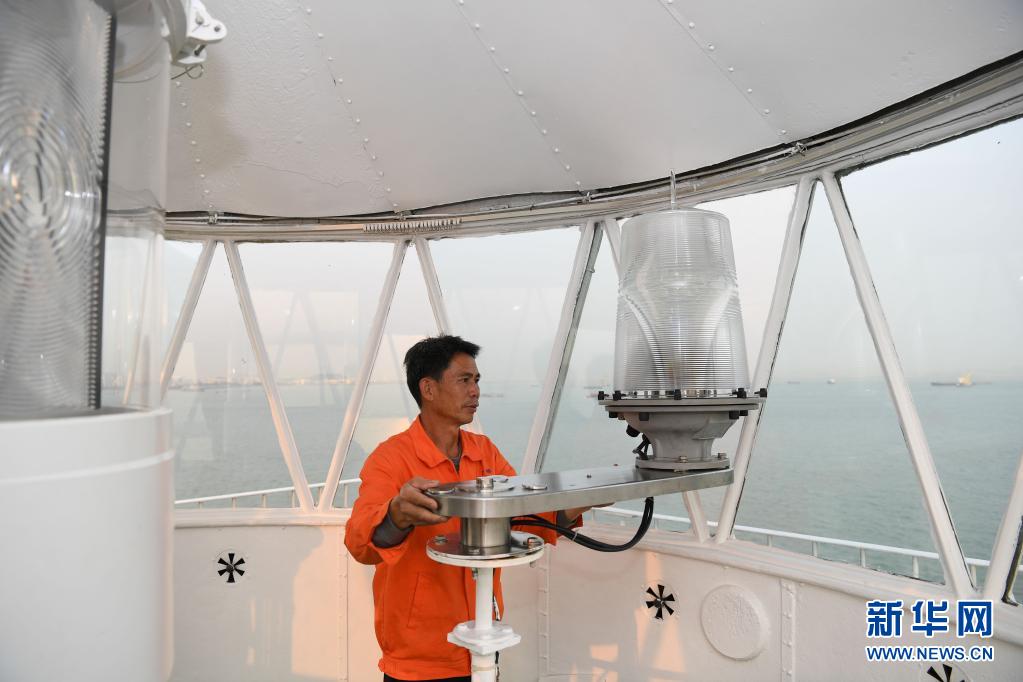 在珠江口伶仃洋北端的舢舨洲,航標(biāo)工黃燦明在檢查燈塔輔燈設(shè)備(2019年4月2日攝)。新華社記者 鄧華 攝