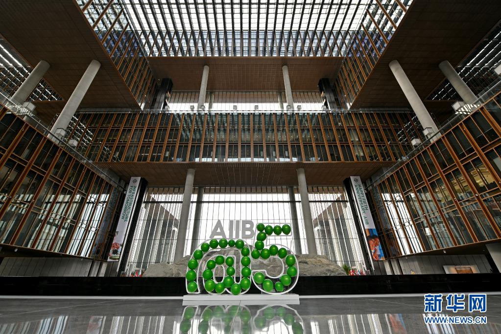 這是亞投行總部大樓內(nèi)景和慶祝正式開業(yè)五周年裝飾(2021年1月13日攝)。新華社記者 李鑫 攝