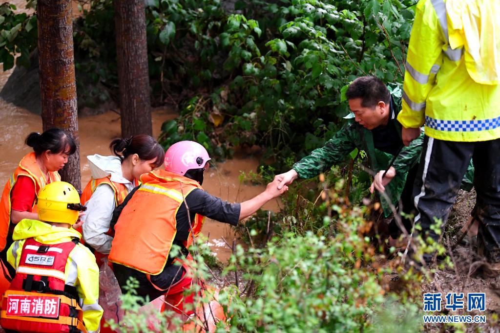 7月21日,在鞏義市米河鎮(zhèn),消防救援人員幫助群眾轉(zhuǎn)移。新華社記者 李嘉南 攝