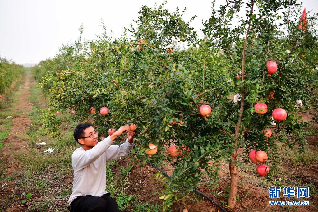 在河南省南陽(yáng)市淅川縣九重鎮(zhèn),軟籽石榴基地的工作人員在采摘石榴(2019年10月19日攝)。新華社記者 馮大鵬 攝