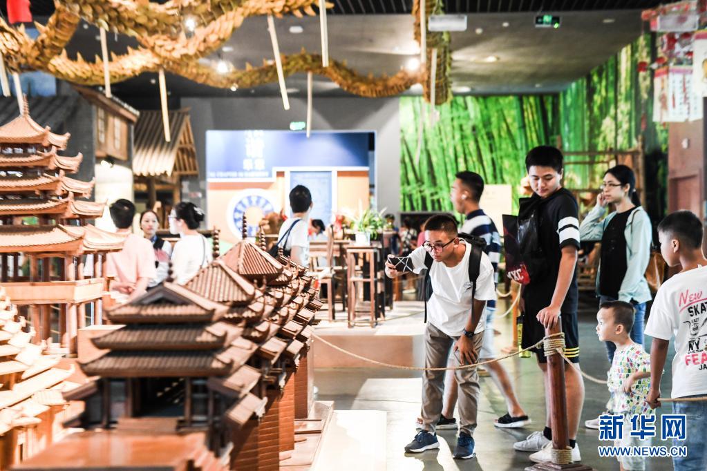 參觀者在廣西民族博物館里參觀風(fēng)雨橋模型(2019年10月4日攝)。新華社記者 曹祎銘 攝