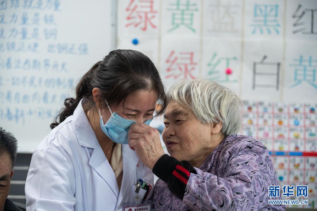 在湖南省邵陽(yáng)市隆回縣隆回魏源醫(yī)院,一名老年公寓的老人跟醫(yī)護(hù)人員親密交流(2020年10月12日攝)。新華社記者 才揚(yáng) 攝