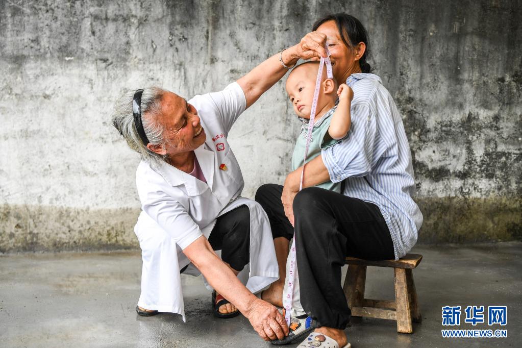 廣西賀州市鐘山縣兩安瑤族鄉(xiāng)竹梅村的鄉(xiāng)村醫(yī)生王秋姣(左)上門(mén)體檢時(shí)給小朋友測(cè)量身高(5月11日攝)。新華社記者 曹祎銘 攝
