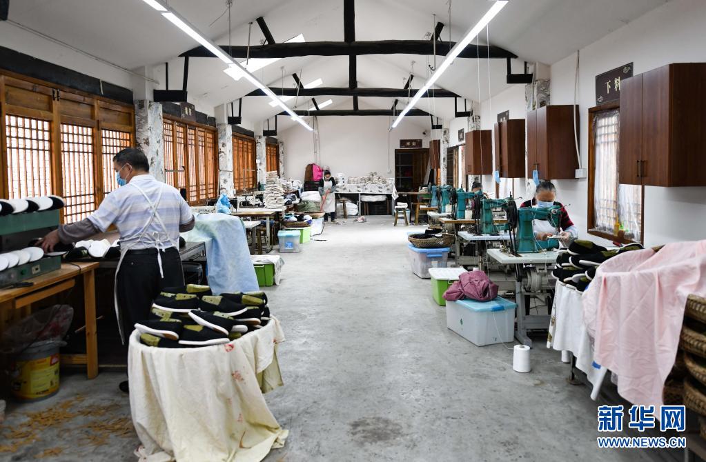 在四川省成都市郫都區(qū)唐昌鎮(zhèn)戰(zhàn)旗村,工人們加緊制作布鞋(2020年4月17日攝)。新華社記者 王曦 攝