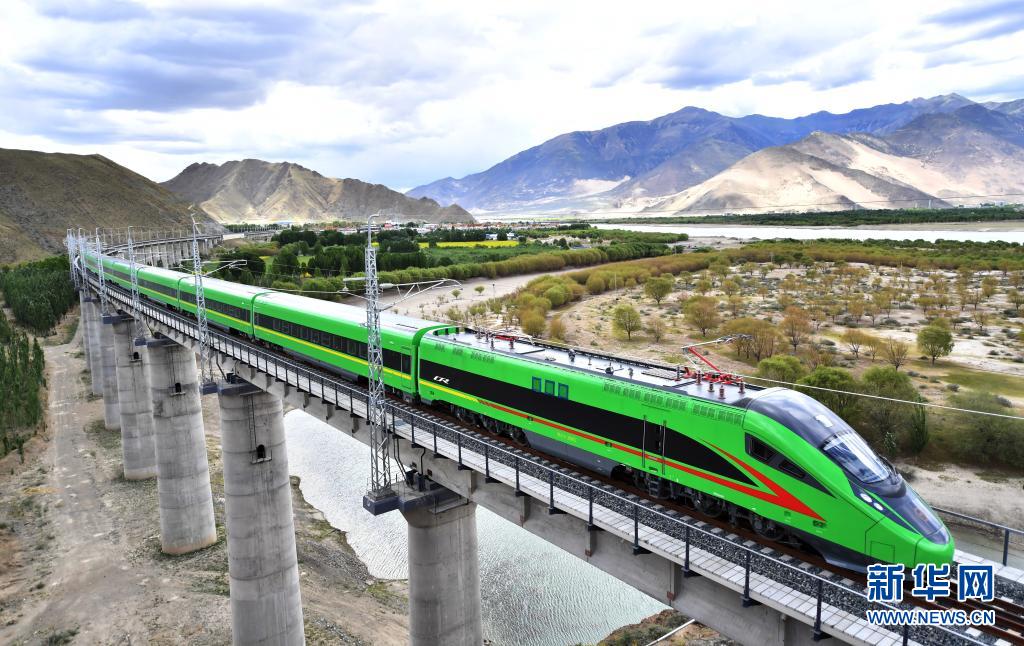 試運(yùn)行的復(fù)興號(hào)列車(chē)行駛在西藏山南市境內(nèi)(6月16日攝)。新華社記者 覺(jué)果 攝
