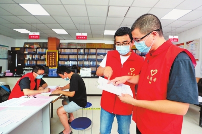 ?? 7月29日,鄭州市未來路街道金色港灣社區(qū),鄭州市大數(shù)據(jù)管理局工作人員與社區(qū)志愿者在統(tǒng)計(jì)居民受損情況。 本報(bào)記者 聶冬晗 攝
