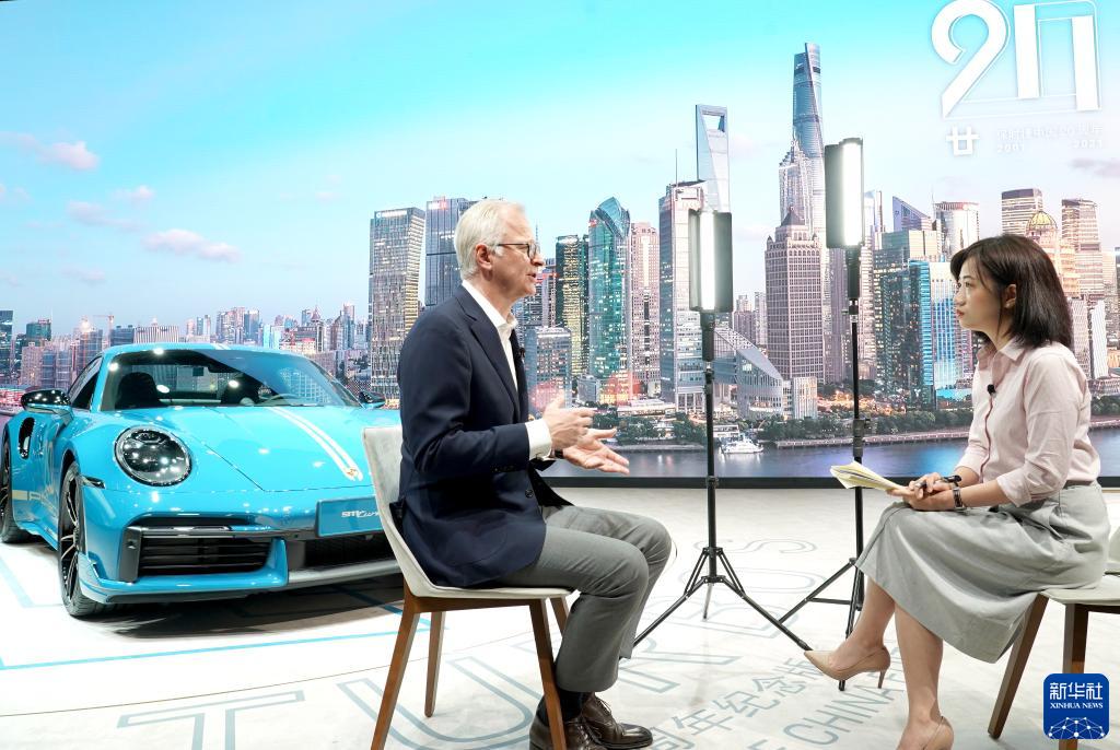 4月19日,保時(shí)捷高管在第十九屆上海國際汽車工業(yè)展覽會(huì)上接受采訪。新華社記者 陳建力 攝