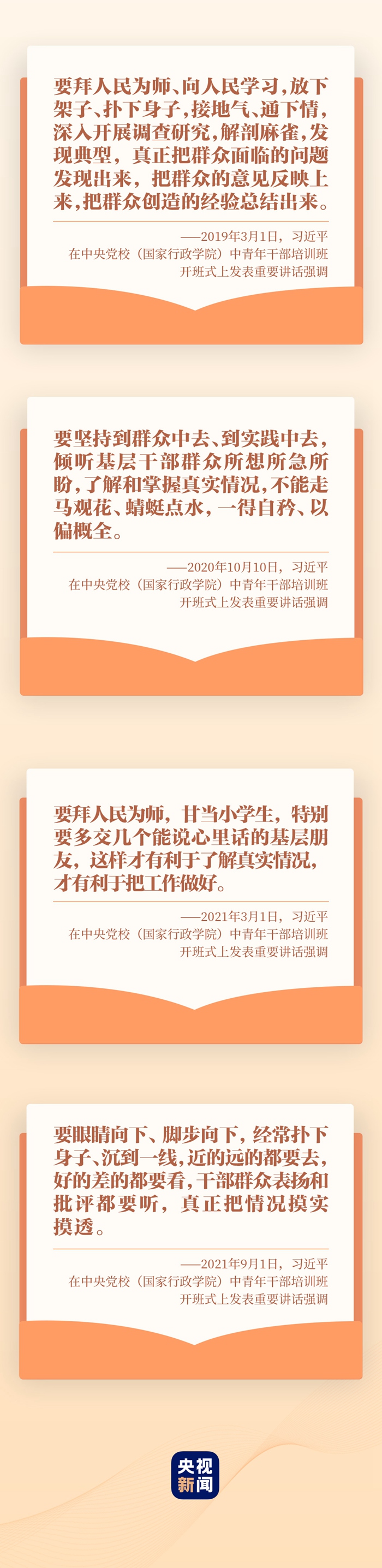 “堅持從群眾中來、到群眾中去,真正成為群眾的貼心人” “既要‘身入’基層,更要‘心到’基層”“掌握調(diào)查研究這個基本功”……2019年以來,習(xí)近平總書記在中青年干部培訓(xùn)班開班式上多次要求干部拜人民為師,深入基層開展調(diào)查研究。