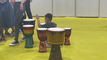 小朋友在服貿(mào)會現(xiàn)場體驗擊鼓