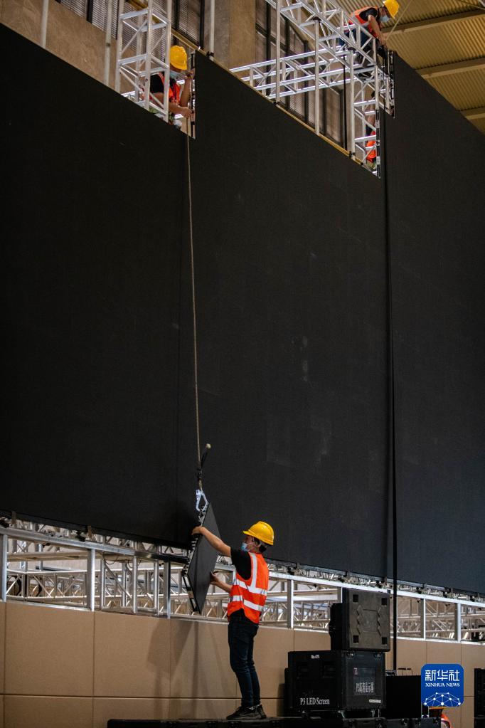在昆明滇池國(guó)際會(huì)展中心,工作人員正在搭建會(huì)場(chǎng)和新聞中心。施工人員均已接種兩劑新冠肺炎疫苗,每天進(jìn)場(chǎng)還要測(cè)體溫、戴口罩。會(huì)場(chǎng)相關(guān)設(shè)備將使用可重復(fù)利用的材料,會(huì)場(chǎng)不進(jìn)行油漆粉刷、噴涂,也不鋪設(shè)地毯。