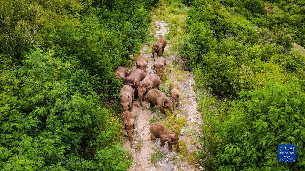 這是8月9日在云南省玉溪市元江縣境內(nèi)拍攝的象群(無(wú)人機(jī)照片)。新華社記者 胡超 攝