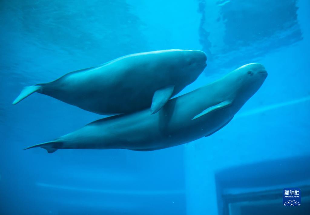 在位于武漢的中國(guó)科學(xué)院水生生物研究所,長(zhǎng)江江豚媽媽和小江豚在水中游動(dòng)(7月5日攝)。新華社記者 肖藝九 攝