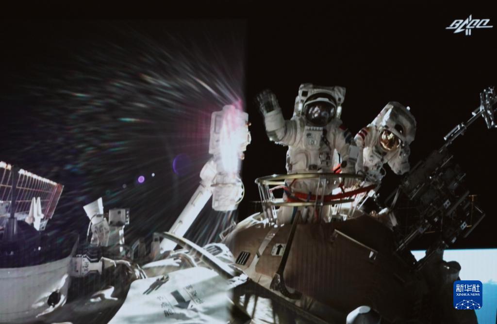 8月20日在北京航天飛行控制中心大屏拍攝的神舟十二號(hào)乘組航天員聶海勝、劉伯明在出艙任務(wù)結(jié)束后揮手示意。新華社記者 田定宇 攝