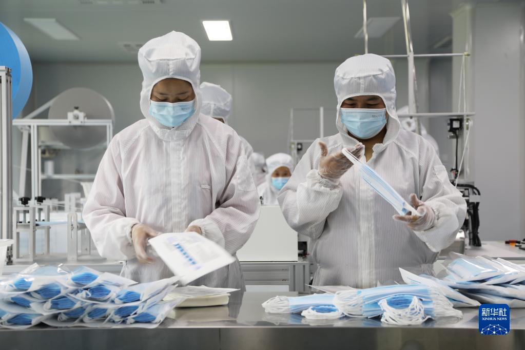 3月26日,在甘肅省臨夏市南龍鎮(zhèn)馬家莊村的甘肅陽(yáng)光智家網(wǎng)絡(luò)科技有限公司醫(yī)用口罩生產(chǎn)車(chē)間內(nèi),工作人員在加工生產(chǎn)醫(yī)用口罩。2021年初,該公司與另外一家材料科技企業(yè)聯(lián)合研發(fā)的石墨烯口罩實(shí)現(xiàn)批量生產(chǎn)。新華社記者 馬莎 攝