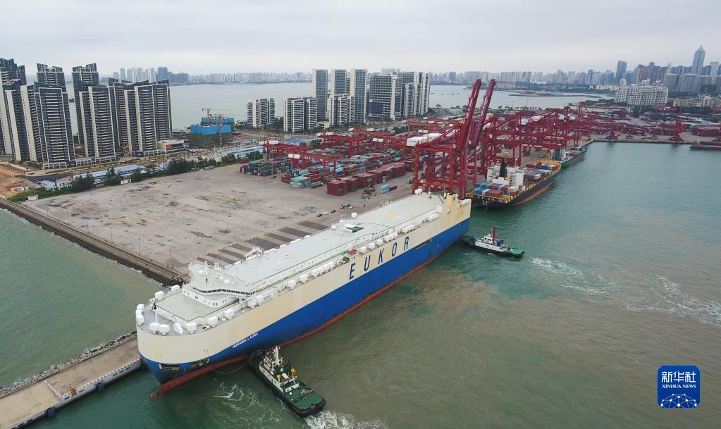 2020年2月16日,滾裝貨船“勞拉”輪駛?cè)牒?谛阌⒏郏o(wú)人機(jī)照片)。這是海南自貿(mào)區(qū)政策實(shí)施后的首艘汽車(chē)外貿(mào)船。新華社記者 楊冠宇 攝