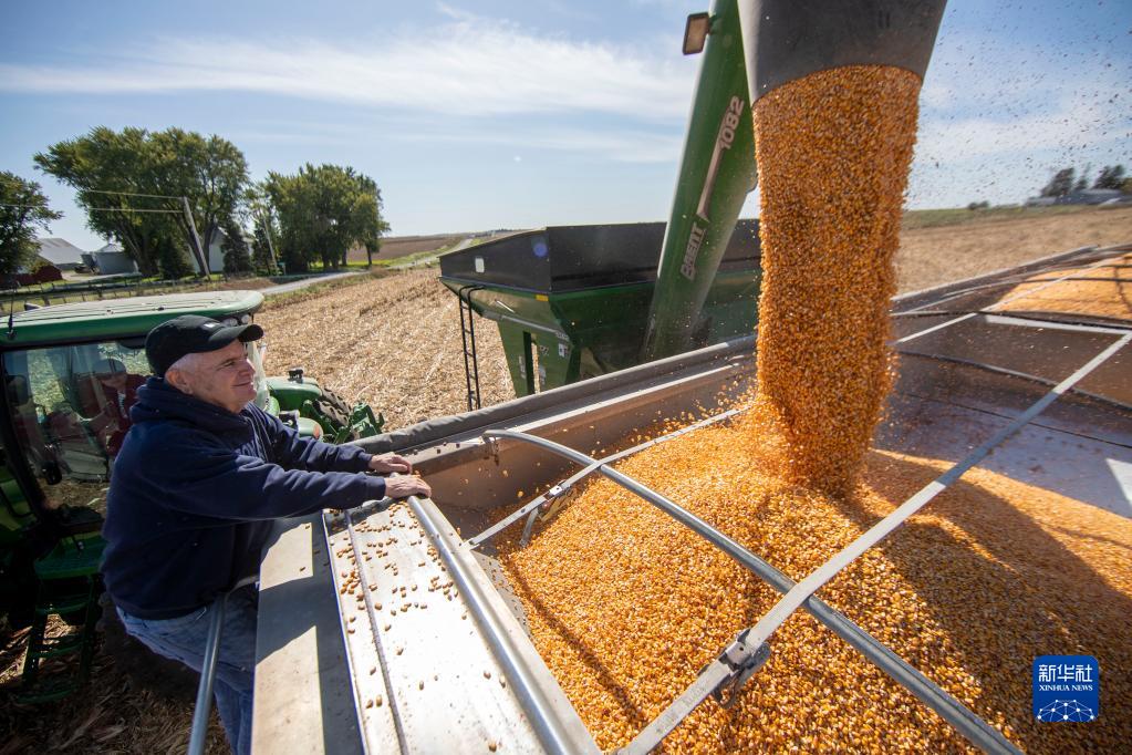2019年10月14日,在美國(guó)艾奧瓦州大西洋鎮(zhèn),比爾·佩雷特看著收獲的玉米裝上卡車(chē)。新華社記者 王迎 攝