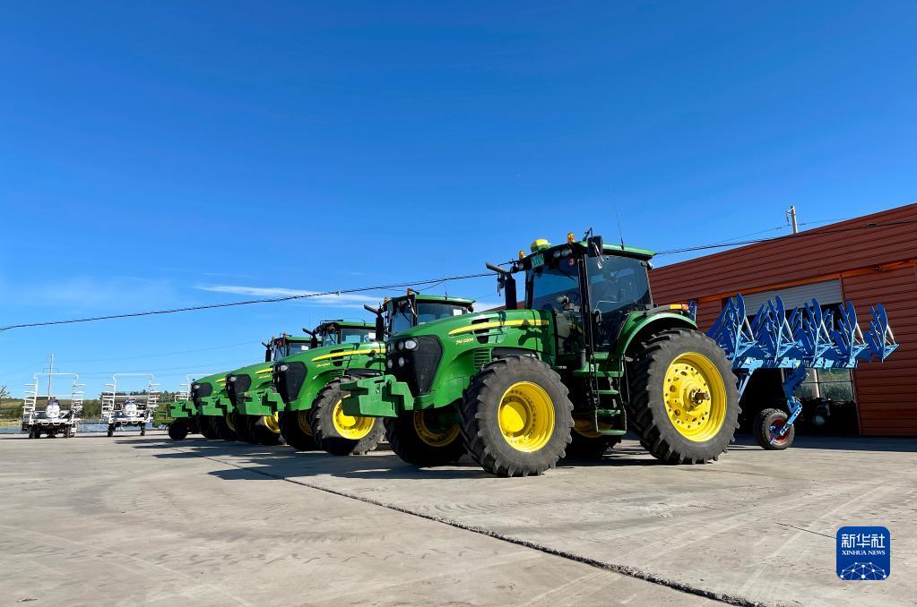 在黑龍江省北安市革命現(xiàn)代農(nóng)機(jī)專(zhuān)業(yè)合作社,現(xiàn)代化農(nóng)機(jī)整齊排放(9月18日攝)。新華社記者 楊思琪 攝