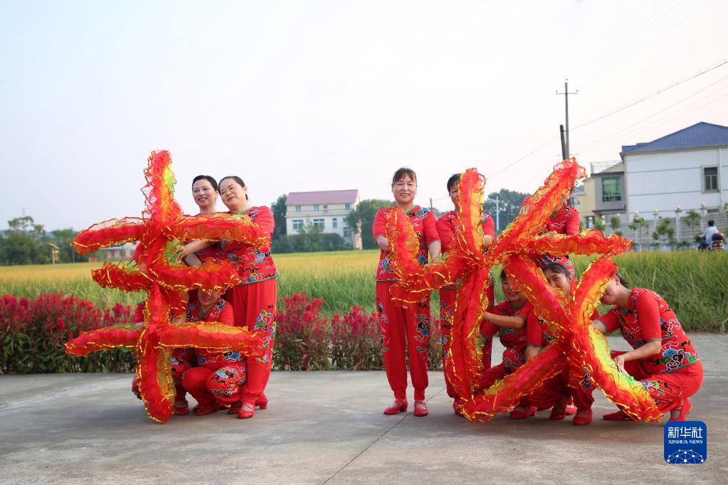 在湖南省汨羅市汨羅鎮(zhèn)九雁村稻田旁的小廣場(chǎng)上,村里的婦女們?cè)谂啪氁载S收為主題的廣場(chǎng)舞(9月17日攝)。新華社發(fā)(胡清 攝)