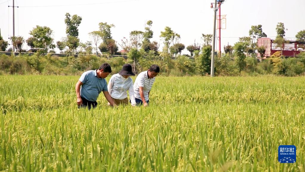 在汨羅鎮(zhèn)江景村,汨羅市農(nóng)業(yè)農(nóng)村局的兩名技術(shù)人員正查看“泰優(yōu)390”的結(jié)實(shí)率。根據(jù)各家情況,他們向村民們科普如何更好地做到綠色病蟲(chóng)害防控、調(diào)整農(nóng)藥和化肥用量。