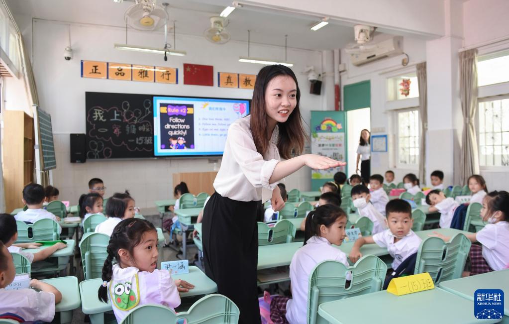 深圳市福田區(qū)南園小學教師、香港理工大學對外漢語教育專業(yè)碩士畢業(yè)的香港青年黃曉蕾在英語課上與孩子們互動(9月1日攝)。新華社記者 毛思倩 攝