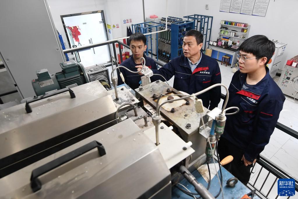 福建閩江學院服裝與藝術(shù)工程學院教授李永貴(中)在“福建省新型功能性紡織纖維及材料重點實驗室”教學生做紡絲實驗(3月22日攝)。新華社記者 林善傳 攝