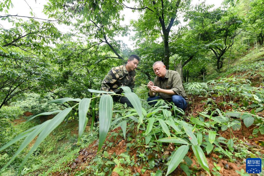 福建建甌市林權(quán)改革發(fā)展服務中心的科技特派員陳國興(右)在建甌市玉山鎮(zhèn)上房村一處林下種植園給村民講授中藥材栽培方法(5月28日攝)。新華社記者 林善傳 攝