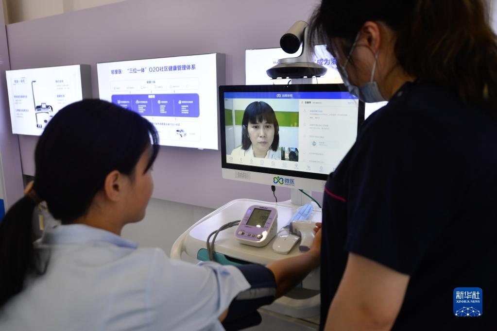 參觀者在烏鎮(zhèn)互聯(lián)網(wǎng)醫(yī)院體驗(yàn)“智能醫(yī)務(wù)室”的體檢功能,并與醫(yī)生進(jìn)行視頻連線(9月25日攝)。新華社記者 黃宗治 攝
