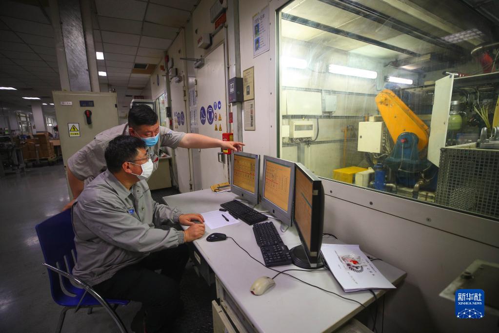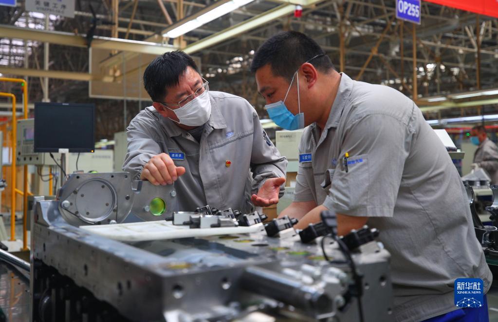 一汽解放大連柴油機有限公司的高級技師鹿新弟(左)在車間與同事交流(2020年5月7日攝)。新華社記者 龍雷 攝