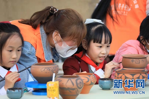 小朋友在仰韶村國家考古遺址公園參與彩陶制作。(聶金鋒 攝)