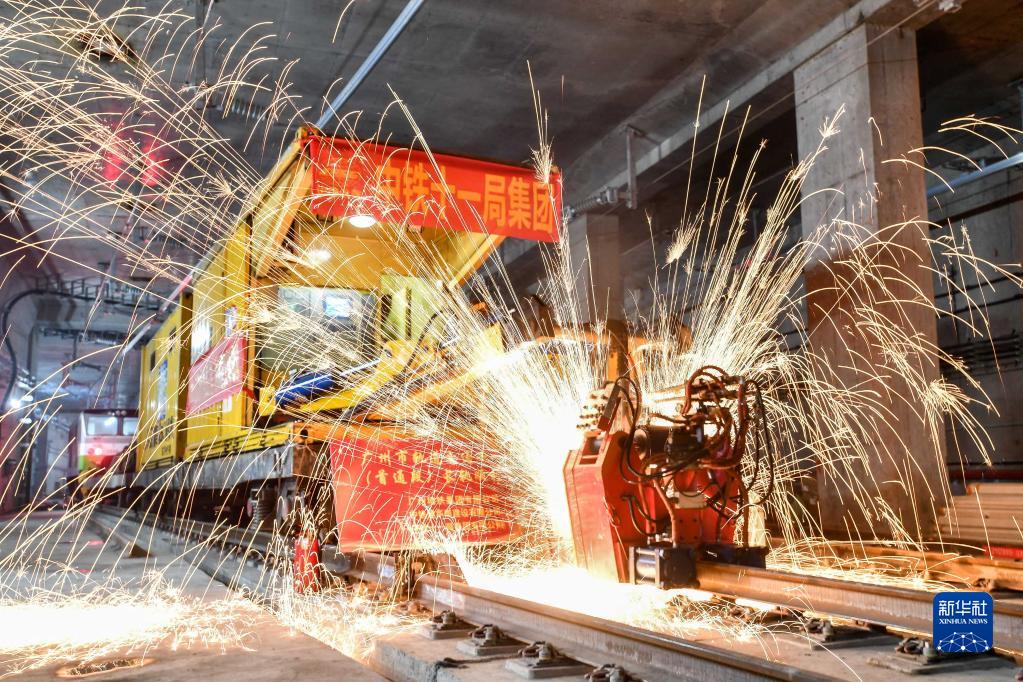 中鐵十一局軌道焊機在焊接廣州地鐵18號線首通段最后一個鋼軌接頭(4月20日攝)。新華社記者 劉大偉 攝