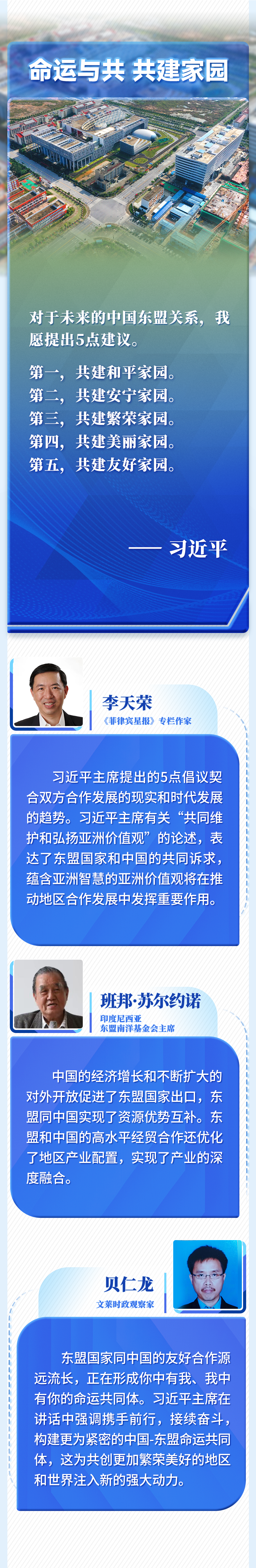 第一,共建和平家園。沒有和平,一切都無從談起。和平是我們最大的共同利益,也是各國人民最大的共同期盼。我們要做地區(qū)和平的建設(shè)者和守護(hù)者,堅(jiān)持對話不對抗、結(jié)伴不結(jié)盟,攜手應(yīng)對威脅破壞和平的各種負(fù)面因素。我們要踐行真正的多邊主義,堅(jiān)持國際和地區(qū)的事大家商量著辦。中方堅(jiān)決反對霸權(quán)主義和強(qiáng)權(quán)政治,愿同周邊鄰國長期友好相處,共同維護(hù)地區(qū)持久和平,絕不尋求霸權(quán),更不會以大欺小。中方支持東盟建設(shè)無核武器區(qū)的努力,愿盡早簽署《東南亞無核武器區(qū)條約》議定書。