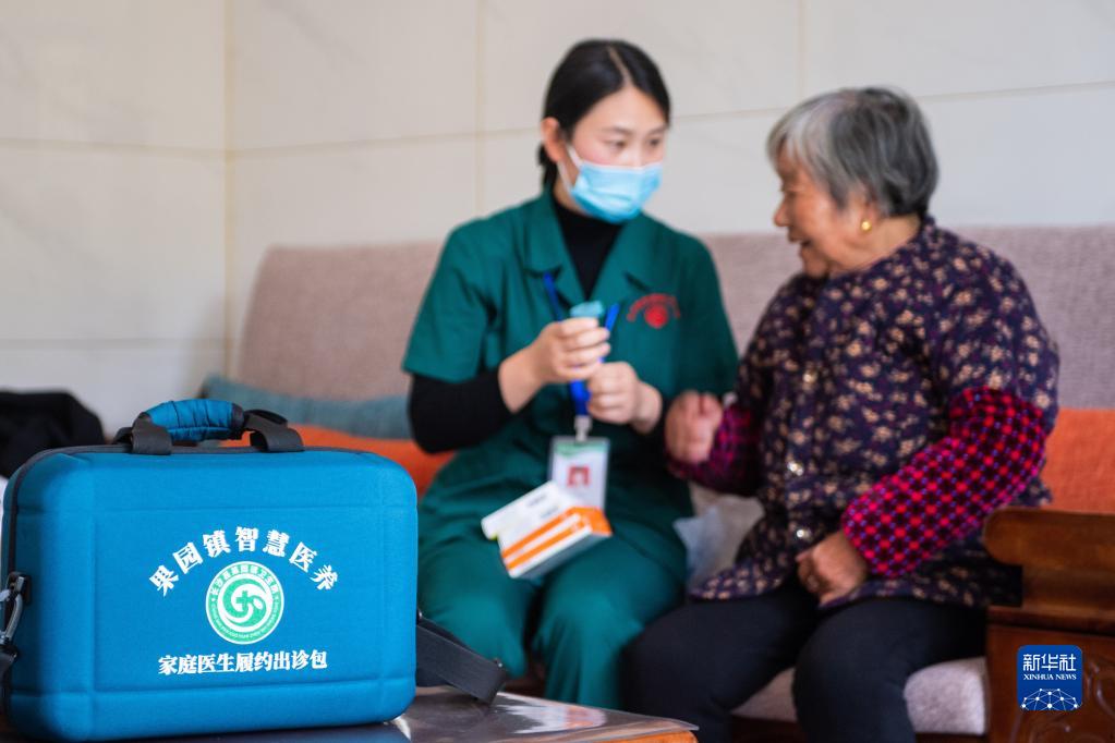11月12日,在湖南省長沙市長沙縣果園鎮(zhèn)楊泗廟社區(qū),醫(yī)務(wù)人員劉敏指導(dǎo)居家老人用藥。新華社記者 陳思汗 攝