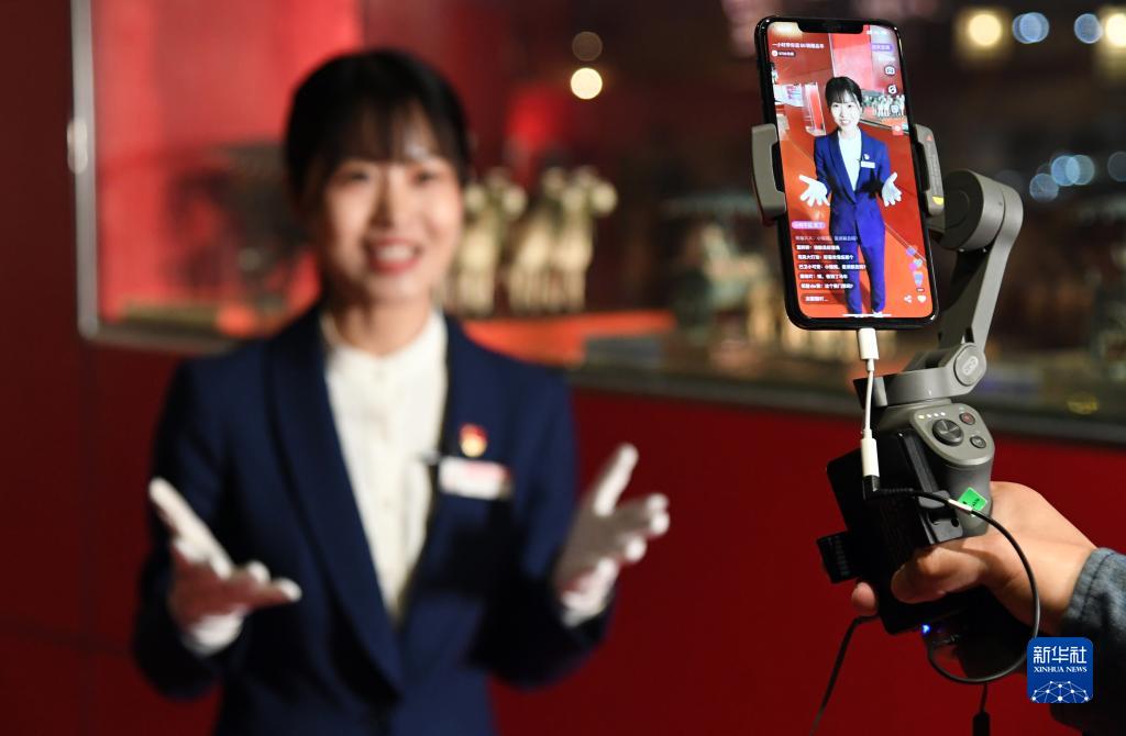 2020年4月30日,在北京汽車博物館,講解員曾紅娟通過(guò)網(wǎng)絡(luò)直播平臺(tái)為觀眾介紹館內(nèi)的藏品車。新華社記者 任超 攝