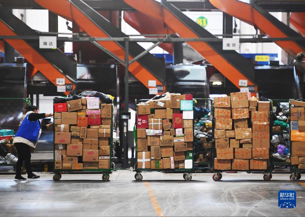 在中國郵政集團有限公司河南省鄭州郵區(qū)中心,工作人員在轉移快遞包裹(11月11日攝)。新華社記者 張浩然 攝