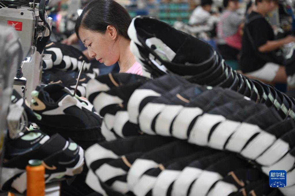 在位于福建省泉州市的鴻星爾克集團鴻榮輕工公司車間,工人在制鞋生產(chǎn)線上作業(yè)(7月30日攝)。泉州市是我國重要的制造業(yè)基地,民營企業(yè)較多。新華社記者 宋為偉 攝