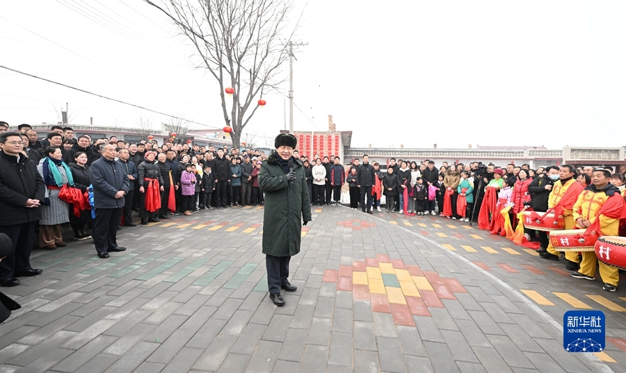 村文化廣場(chǎng)上十分熱鬧,村民們打起威風(fēng)鑼鼓、扭起秧歌歡慶佳節(jié)。看到總書記來了,人們高興地歡呼起來。習(xí)近平對(duì)鄉(xiāng)親們說,我們黨的根本宗旨就是為人民群眾辦好事,為人民群眾幸福生活拼搏、奉獻(xiàn)、服務(wù)。我們?nèi)缙诖蜈A了脫貧攻堅(jiān)戰(zhàn),如期實(shí)現(xiàn)了全面建成小康社會(huì)目標(biāo),現(xiàn)在踏上了全面建設(shè)社會(huì)主義現(xiàn)代化國(guó)家新征程。建設(shè)現(xiàn)代化國(guó)家離不開農(nóng)業(yè)農(nóng)村現(xiàn)代化,要繼續(xù)鞏固脫貧攻堅(jiān)成果,扎實(shí)推進(jìn)鄉(xiāng)村振興,讓群眾生活更上一層樓,在推進(jìn)農(nóng)業(yè)農(nóng)村現(xiàn)代化中越走越有奔頭。