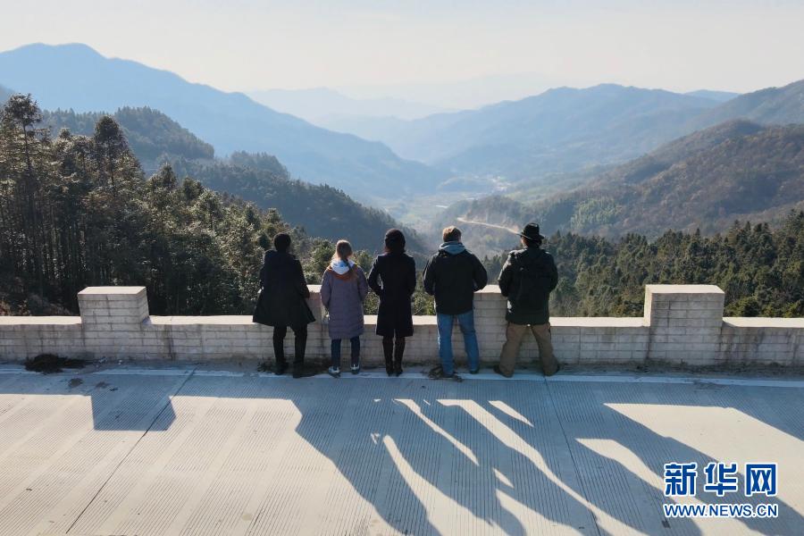 新華社記者繆曉娟和植國明、肖恩、瑞貝卡·尼什、烏俊杰在山間觀景(2020年12月20日攝,無人機照片)。新華社記者 陳諾攝
