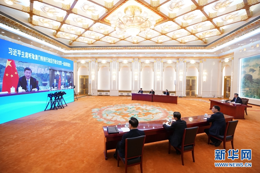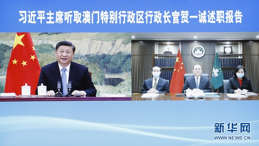 1月27日,國家主席習(xí)近平在北京以視頻連線方式聽取了澳門特別行政區(qū)行政長(zhǎng)官賀一誠2020年度的述職報(bào)告。新華社記者 劉彬 攝