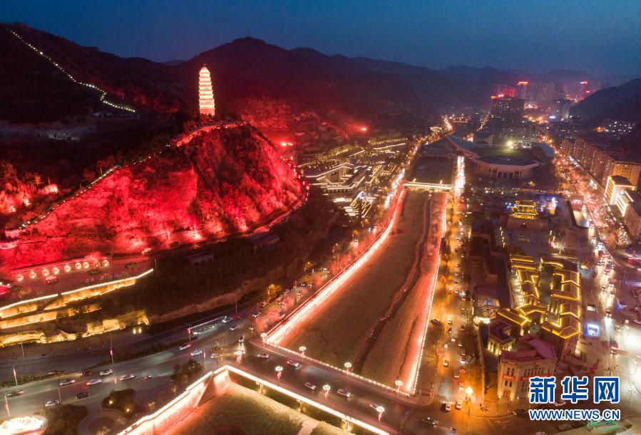 寶塔山下延安城區(qū)夜景(2月8日攝,無人機照片)。新華社記者 邵瑞 攝