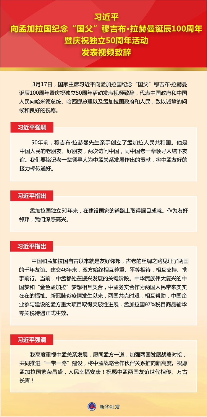 新華社北京 3 月 17 日電 3 月 17 日,國家主席習(xí)近平向孟加拉國紀(jì)念 “ 國父 ” 穆吉布 · 拉赫曼誕辰 100 周年暨慶祝獨(dú)立 50 周年活動(dòng)發(fā)表視頻致辭,代表中國政府和中國人民向哈米德總統(tǒng)、哈西娜總理以及孟加拉國政府和人民,致以誠摯的問候和良好的祝愿。
