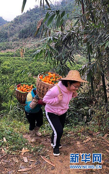 黃文秀與村民一起采摘運(yùn)輸砂糖橘(資料照片)。新華社發(fā)