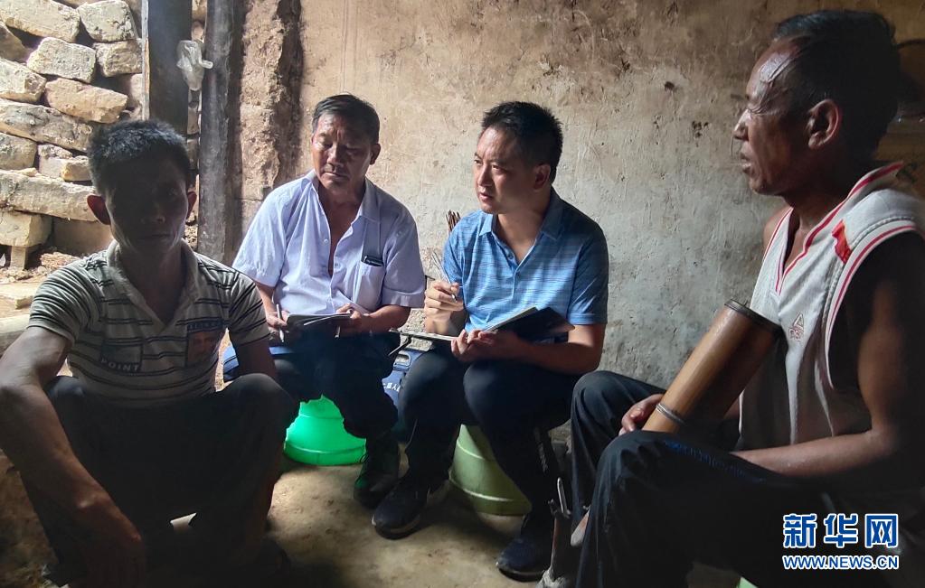 記者何偉(右一)與同事采訪廣西百色市樂業(yè)縣百坭村新任駐村第一書記楊杰興(中)(2019年7月31日攝)。新華社記者 徐海濤 攝