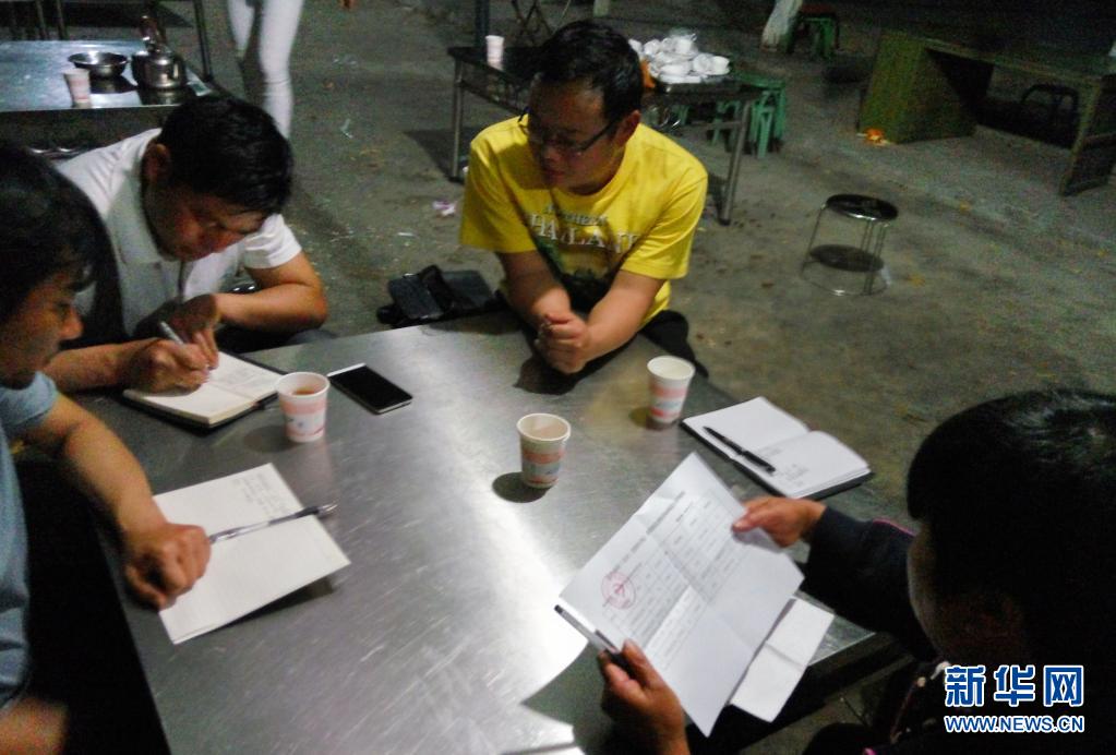 吳國良(右二)與扶貧干部交流工作進(jìn)展(資料照片)。新華社發(fā)