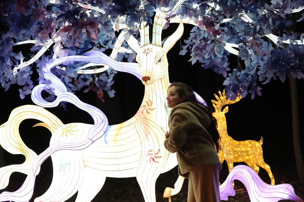??2023年12月14日,一名女子在法國(guó)巴黎風(fēng)情園舉辦的“山海有靈”法國(guó)豫園燈會(huì)上拍照留念。新華社記者 高靜 攝