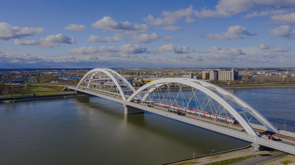 ??2024年3月12日,一列火車運(yùn)行在匈塞鐵路塞爾維亞境內(nèi)貝諾段諾維薩德多瑙河大橋上(無(wú)人機(jī)照片)。新華社發(fā)(任衛(wèi)云攝)